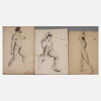 drei Blatt mit der Darstellung nackter Männer in verschiedenen Posen, feine akademische Zeichnungen, Bleistift auf verschiedenen Papieren, jeweils signiert „Karl Robiczek“ und teils datiert 1860 und 1862, unterschiedliche Erhaltungen, ungerahmt, Blattmaß max. 43,5 x 28 cm. Künstlerinfo: auch Carl Robiczek, Genre- und Landschaftsmaler (1839 Warschau bei Austerlitz/Böhmen bis 1918 Fürstenfeldbruck), Studium an der Akademie in Wien, ab 1860 Studium an der Akademie in München, nachfolgend in München tätig, 1880 Umzug nach Fürstenfeldbruck, der Künstler zählt zu den bekanntesten Vertretern der ”Brucker Maler”, Quellen: Thieme-Becker, Matrikel der Münchner Akademie und Internet.