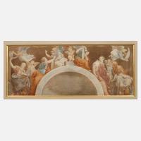 zahlreiche antikisierende Personen und Engel, um einen Bogen gruppiert, teils mit spitzem Pinsel ausgeführte Malerei mit feiner Tonabstufung, Aquarell auf Papier, 2. Hälfte 19. Jh., unsigniert, rückseitig französischer Rahmungsaufkleber, unter Passepartout gerahmt (Rahmen und Passepartout mit Erhaltungsmängeln), Passepartoutausschnitt ca. 15 x 36 cm.