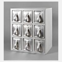 Entwurf 1926, aus der sogenannten Frankfurter Küche, gestempelt ”Original Haarer Hanau a.M.”, neun Schütten aus Aluminium, vorn jeweils beschriftet, im Einbauregal, Maße 43 x 47 x 31 cm. Quelle: Frauen im Design, S. 149–173, Abb. S. 170–1; Neues Bauen Neues Gestalten, S. 180f.