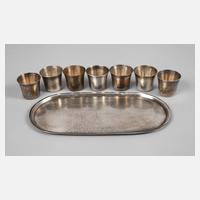 Plauener Silberschmied und Bauhausschüler, 1906-1972, gestempelt Halbmond, Krone, 900, H. Heck sowie JH in Raute, getriebenes ovales Tablett mit sieben passenden Bechern, normale Altersspuren, L Tablett 25 cm, G gesamt ca. 484 g.