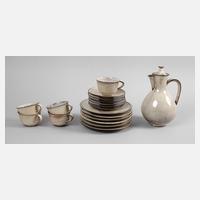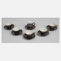 Entwurf Marguerite Friedlaender um 1935, geprägte Burgmarke, Kännchen mit Künstlersignet, ziegelroter Scherben, innen hellgrau glasiert, außen verlaufende dunkelbraune Lüsterglasur, fünf Tassen, sechs Untertassen, ein Sahnekännchen, diese mit zwei stärkeren Bestoßungen am Rand, eine Tasse mit kleinem Chip, H max. 6,5 cm.