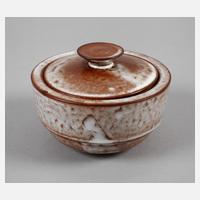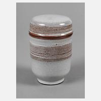 Ritzmarke im Kreis 1931–1935, Jahresgabe für die ”Freunde der Dornburger Keramik”, rötlicher Scherben mit gesprenkelter Glasur in grauen und braunen Tönen, innen weißlich verlaufend glasiert, Zylinderform, mit eingezogenem Stand, übergreifender Deckel mit großem flachen Griff, am Deckelrand zwei kleine Oberflächenchips, sonst guter Zustand, H 25 cm. Quelle: Bauhaus Archiv, Keramik und Bauhaus, Ausstellung 1998, S. 134, Nr. 108, dort mit schwarzer Glasur.