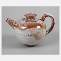 Entwurf um 1935, geprägte Burgmarke, dunkelbrauner Scherben mit gesprenkelter weißlicher Glasur, kugeliger Kannenkörper, konisch erweiterter Hals mit eingesetzter Ausgußröhre, Bandhenkel, die Ränder dunkel abgesetzt, bestehend aus Kanne, sechs Tellern, sechs Untertassen und fünf Tassen, eine Untertasse mit größerer oberflächlicher Fehlstelle, zwei Tassen mit Gebrauchsspuren (innen glasurrissig und ein kleiner Chip, H Kanne 25 cm. Quelle: Katja Schneider, Burg Giebichenstein, Tafelband 1992, S. 324, Abb. 229.3.