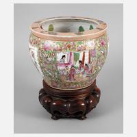 China, Ende 19. Jh., am Boden mit gepinselter Sechs-Zeichen-Marke, Porzellan in polychromer Emailbemalung mit reicher Goldstaffage, die gebauchte Wandung außen verziert von figürlichen Darstellungen zwischen üppigen Floralismen, Insekten- und Vogeldarstellungen, innen verziert mit schwimmenden Kois, Altersspuren, auf nicht ganz passendem, durchbrochen gearbeitetem Massivholzsockel, dessen Unterseite mit zusätzlichem Klebeetikett, kleine Fehlstelle, H ges. 34 cm.
