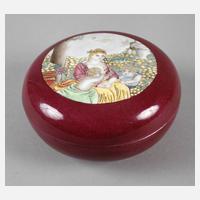 1930er Jahre, am Boden mit Vier-Zeichen-Marke, Porzellan ochsenblutfarben glasiert und in Emailfarben bemalt, runde Deckeldose mit abnehmbarem Deckel, dieser mit historisierender Szene bemalt, Darstellung eines jugendlichen Fräuleins, begleitet von zwei Putten in mediterraner Landschaft, etwas berieben, D 14 cm.