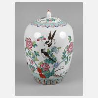 um 1880, am Boden gestempelte Sechs-Zeichen-Marke, weiß glasiertes Porzellan in polychromer Emailbemalung, stark gebauchter Korpus mit Paradiesvogelmotiven zwischen üppigen Floralelementen, gerahmt von Ornamentbordüre, flacher aufgelegter Deckel mit zapfenförmigem Knauf, etwas brandfleckig, min berieben, H 30 cm.