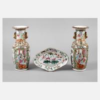 China, um 1900, ungemarkt, bestehend aus Vasenpaar und Schale, Weißporzellan in polychromer Emailbemalung mit Goldstaffage, die Basen der Vasen umlaufend mit figürlichen Darstellungen, Floraldekor sowie Insekten- und Vogelmotiven verziert, plastisch aufgelegte Drachenmotive und Handhaben in Form von Foo-Hunden, die geschwungene Schale mit Seerosenmotiv, eine Vase alt geklebt, Altersspuren, H Vase je 25 cm, L Schale 20 cm.