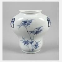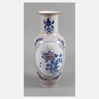 2. Hälfte 20. Jh., am Boden unleserliche Stempelmarke Fung Fong, weiß glasiertes Porzellan mit kobaltblauer polychromer Aufglasurbemalung, schlanker, leicht gebauchter Korpus mit zylindrischem Hals und ausschwingender Mündung, Front und Rückseite mit floral gestalteter Kartusche, gerahmt von Pünktchendekor, min. berieben, H 47 cm.