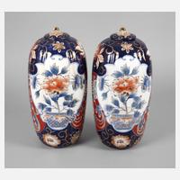 Anfang 20. Jh., am Boden mit gepinselter Marke, Porzellan in polychromer Aufglasurbemalung mit üppiger Goldstaffage, gebauchter Korpus, verziert mit figürlichen Darstellungen sowie floralen Elementen und Vogelmotiven, gerahmt von Ornamentbändern, zylindrischer Hals mit je zwei überlappenden Handhaben, eine Mündung mit Ausbrüchen, Altersspuren, H je 31 cm.