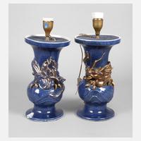 1920er Jahre, ungemarkt, balusterförmige Lampenfüße aus kobaltblau glasiertem Porzellan mit zarter Goldstaffage, plastisch aufgelegte Drachen, jeweils einflammig elektrifiziert, bestoßen, ohne Schirme, H je 40 cm.