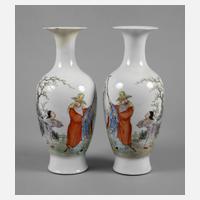 Anfang 20. Jh., am Boden gepinselte Vier-Zeichen-Marke, weiß glasiertes Porzellan in polychromer Emailbemalung, die gebauchten Korpora verziert mit figürlichen Darstellungen in Landschaft, teils restauriert bzw. mit Rissbildung, H je ca. 24,5 cm.