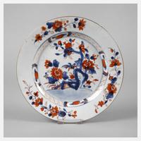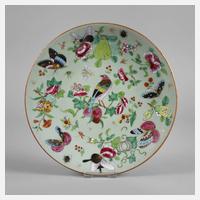 um 1900, an der Unterseite mit gepinselter Vier-Zeichen-Marke in Unterglasur, selandonfarben glasiertes Porzellan in polychromer Emailbemalung, zurückhaltende Goldstaffage, komplett durchmusterte Fahne und Spiegel mit Vogel-, Schmetterlings- sowie Insektenmotiven zwischen Blüten und Früchten, zarter Haarriss im Randbereich, D 25,5 cm.