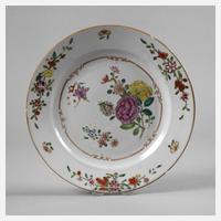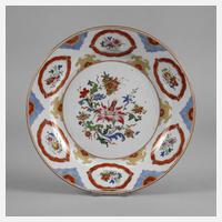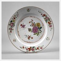19. Jh., ungemarkt, Porzellan in polychromer Emailbemalung mit zarter Goldstaffage, im Spiegel Blumenbukett, gerahmt von Ornamentband, die Fahne verziert mit Floralismen, Erhaltungsmängel, D 22,5 cm.