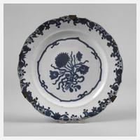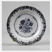 19. Jh., ungemarkt, Porzellan in kobaltblauer Unterglasurbemalung, im Spiegel Blumenbukett, gerahmt von Ornamentband, die geschweifte Fahne verziert mit Floralismen, mit Wandhalterung, Erhaltungsmängel, D 22,5 cm.