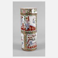 China, Mitte 20. Jh., am Boden undeutlich gemarkt, Porzellan in polychromer Emailbemalung mit reicher Goldstaffage, schlanker, zylindrischer Korpus umlaufend mit figürlichen Darstellungen verziert, gerahmt von floralem Rankwerk und Vogeldarstellungen, eingezogene Mündung, leichte Altersspuren, etwas berieben, H 32 cm.