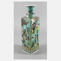 Ende 19. Jh., am Boden mit Sechs-Zeichen-Kangxi-Marke, weiß glasiertes Porzellan in üppiger Emailbemalung, facettierter Korpus, umlaufend von figürlichen Darstellungen in Landschaft verziert, gerahmt von Ornamentbändern, zylindrischer Hals mit ausschwingender Mündung, gute Erhaltung mit min. Altersspuren, H 47 cm.