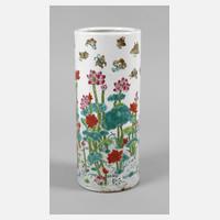 China, 1920er Jahre, am Boden gemarkt, Porzellan in polychromer Emailbemalung, schlanker, zylindrischer Korpus, umlaufend verziert mit Landschaftsmotiv, welches ein fröhlich plantschendes Entenpaar am Seerosenteich zeigt, eingezogene Mündung, leichte Altersspuren, etwas berieben, H 28 cm.