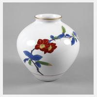 1970er Jahre, am Boden mit blauer Unterglasurmarke, schlichter kugeliger Korpus aus Weißporzellan in polychromer Emailbemalung und zarter Goldstaffage, zurückhaltendes Dekor mit Kirschblütenzweig, gute Erhaltung, H 19 cm.
