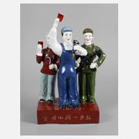 China, 1970er Jahre, am Boden ritzsigniert, an der Vorderseite bezeichnet, Porzellan in polychromer Aufglasurbemalung, auf rechteckiger Plinthe drei vollplastische Figuren einer Bäuerin, eines Arbeiters und eines Soldaten, H 27,5 cm.
