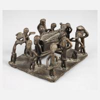 Benin, Bronze mehrteilig gefertigt und auf rechteckiger Plinthe montiert, Darstellung der Beerdigung eines Würdenträgers, mit vier Sargträgern und einer Eskorte, bestehend aus elf Personen, die Schaufeln und Grabbeigaben tragen, herstellungsbedingte kleine Fehlstelle, Maße 6,5 x 10 x 12,5 cm.