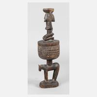 Mali, 20. Jh., der Volksgruppe der Bambara zugeordnet, Holz fein beschnitzt, in Form einer weiblichen Pferdeantilope, auf dem Rücken eine kleine Antilope tragend, dies ist das Stammestier der Bambara, der Aufsatz wird im Tji-Wara Ritus verwendet, das ist der fünfte der sechs Initiationsriten der Bambara, der sich der Verbindung zum Kosmos annimmt und die Beziehung zum Ackerbau herstellt, das Unterteil besteht aus grobem Gewebe und geflochtenen Pflanzenfasern, umlaufend mit Kaurischnecken verziert, meisterhafte Arbeit, H ca. 100 cm.