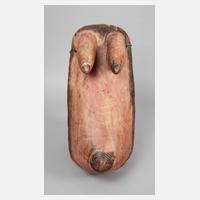 1. Hälfte 20. Jh., aus weichem Tropenholz gefertigt, braungefärbter Grund mit Resten alter Farbfassung, Kragenrand und Haar aus Bast, Kopfschmuck aus Federn, Bart aus Fell auf Papier, starke Krustierung, kleinere Substanzverluste, alter Anobienbefall, Maße 40 x 25 x 30 cm.