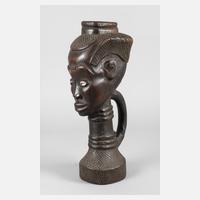 Ebenholz geschnitzt, Darstellung des Kopfs einer Afrikanerin, mit Kaurischnecken als Augen, Haare und Basis mit Kerbschnitt verziert, der lange Hals mit Reifenzier, rückseitig mit großem Griff, oben ausgehöhlt, wohl als Trinkgefäß gedacht, neuwertig, H 45 cm.