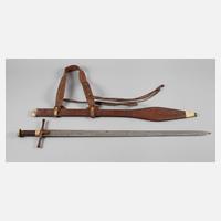 Nordafrika, 20. Jh., Griff aus Holz mit Lederfäden umwickelt, breite Kopfscheibe und Abschluss aus Krokodilleder, Parierstange und Grifflappen aus Eisen, beidseitig geschliffene Klinge mit gravierter arabischer Schrift und eingeschlagenem Muster, Gefäßteile etwas korrodiert, Lederscheide und originales, geflochtenes Tragegeschirr mit Zierprägung, Tragespuren, Z 2, L 100 cm.