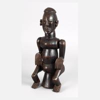 Westafrika, 20. Jh., den Ibibio aus dem Nigergebiet zugeschrieben, hartes, schwarz eingefärbtes Tropenholz fein beschnitzt, vollplastische Darstellung eines sitzenden Mannes mit beweglichen Gliedmaßen und Kappe auf dem Kopf, H 42 cm.