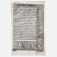 Inkunabel, um 1500, wohl Simon Vostre Paris, reich verzierter, rahmender Metallschnitt, vorgezeichnete Linien in Rot, Majuskeln farbig nachgestaltet, hinter Passepartout, normale Altersspuren, Blattmaß ca. 18,4 x 11,5 cm.