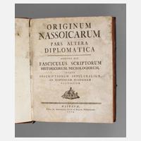 [Genealogie Nassau] pars altera Diplomatica, additus est fasciculus scriptorum historicorum, necrologiorum, atque inscriptionum sepulcralium, ad historiam nassoicam facientium, Wiesbaden bei Schirmer 1779, Format Gr. 8°, 531 S., Ledereinband mit Rückenschildchen, Rotschnitt, einige Seiten fleckig, Titelseite restauriert, altersgemäß noch guter Zustand.