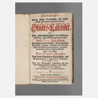 Siebenfacher Königl. Groß-Britannisch- und Chur-Fürstl. Braunschweig-Lüneburgischer Staats-Calender über dero Chur-Fürstenthum Braunschweig-Lüneburg, und desselben zugehörige Lande aufs 1756. Jahr Christi, darinnen der Verbesserte, Gregorianische Julianische, Jüdische, Türkische und Römische, nebst einem Schreib-Calender enthalten, auch andere zum Calender gehörige Sachen zu sehen sind, welchen allen beigefüget das Staats-Register von denen königlichen Regierungen, und übrigen hohen Civil- und Militair-Bedienten in den Teutschen Landen [...], Lauenburg, Format Kl. 8°, 30 Blatt, 128 S. und 20 Blatt, marmorierter Pappeinband, Einband mit sichtbaren Altersspuren, Leerseiten teilweise beschrieben, altersgemäß normaler Zustand.