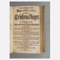 oder der wohlgeübte und Erfahrene Jäger, darinnen eine vollständige Anweisung zur gantzen Hohen und Niedern Jagd-Wissenschaft in Vier Theilen, 2. Aufl. Leipzig 1754, Format Gr. 4°, 15 Blatt, I. Teil/Von denen Eigenschaften der wilden Thiere und Vögel, 148 S., II. Teil/Von den nöthigen Jagd-Rquisitis, 264 S. und 17 Kupfer, III. Teil/Von der Beschaffenheit der Holtzungen und andern zum edlen Weidwerck gehörigen Wissenschaften, 184 S., 3 Kupfer, IV. Teil/Von allerhand nöthigen Jagungs-Sachen und Beschaffenheit der Höltzer mit verschiedenen Phisicalischen und Philosophischen Anmerckungen, 108 S., 32 Blatt Register, Pergamenteinband, Titelholzschnitte, auf Nachsatz handschriftliche Notierung ”Aschaffenburg am 2ten Sept [gestrichen] Februar 1848+ Abends um 3/4 auf 5 Uhr geschrieben”, wenige Bleistiftanmerkungen neben dem Text, altersgemäß noch gute Erhaltung mit Gebrauchsspuren.