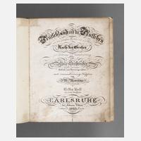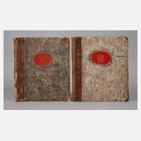 zwei Notenbücher, 1: Idomeneo, Oper in drei Aufzügen von W. A. Mozart, In vollständigem Clavierauszug mit deutsch- und italienischem Texte und zugleich für das Piano-Forte allein, Ihrer Königlichen Hoheit der Frau Markgräfin Leopold zu Baden in tiefster Ehrfurcht zugeignet von dem Verleger, Wohlfeile Ausgabe v. W. A. Mozarts sämtlichen Opern, 7. Lieferung, Mannheim bei Heckel, ohne Jahr [1830], 173 S. – 2: Der Schauspiel-Director, ein komisches Singspiel [...] sowie Titus, Oper in II Aufzügen [...], Mannheim, ohne Jahr [1820), 33 und 111 S.; jeweils Format 4°, Halbledereinbände mit Schmuckdeckeln, Einbände mit sichtbaren Alters- und Gebrauchsspuren, Altersflecken des Papiers, befriedigender Zustand.