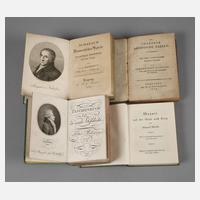 bestehend aus vier Büchern, 1: Taschenbuch für die neuste Geschichte, herausgegeben von D. Ernst Ludwig Posselt, Dritter Jahrgang, mit Küffnerischen Kupfern, Nürnberg 1796, XVI und 268 S., zahlreiche Kupferstiche, originaler Pappeinband mit Altersspuren, Buchblock in schönem Zustand. – 2: Des Phaedrus Aesopische Fabeln, aus dem Lateinischen metrisch übersetzt von Johann Paul Sattler, Nürnberg 1798, 159 S., originaler Pappeinband, altersgemäß guter Zustand. – 3: Almanach Dramatischer Spiele zur geselligen Unterhaltung auf dem Lande von A. von Kotzebue, achtzehnter Jahrgang, Leipzig 1820, VIII und 320 S., Titelkupfer, zahlreiche kolorierte Figurenstiche, aus dem Inhalt: Die eifersüchtige Frau, Verlegenheit und List, Die Frau vom Hause; originaler Pappeinband, altersgemäß schöne Erhaltung mit Altersspuren des Einbandes. – 4: Mozart auf der Reise nach Prag von Eduard Mörike, mit 14 Originallithographien von Fritzi Löw, Wien ohne Jahr, 123 S., zahlreiche Abbildungen, Schmuckvorsatz, normale Altersspuren.