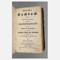 nebst einem Anhange wichtiger Haushaltungsregeln und der Angabe und Vergleichung der vornehmsten deutschen Maße und Gewichte wodurch dasselbe für ganz Deutschland brauchbar wird, von Betty Gleim, 7. Auflage, Bremen bei Heyse 1840, Format Kl. 8°, LX und 632 S., erneuerungsbedürftiger Halbledereinband, am Gelenk mit Leim stabilisiert, wodurch das Buch schwer aufgeht, Buchblock aber in noch gutem Zustand mit normalen Gebrauchsspuren.
