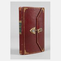 Gott ist die reinste Liebe, Meine Betrachtung und mein Gebet vom Hofrath von Eckartshausen, durchgesehen und verbessert von Johann Martin Gehrig, neue rechtmässige Original-Ausgabe mit 3 schönen Kupfern, Würzburg 1828, Format Kl. 8°, 252 S., in rotem Lederetui mit Rückenschildchen und goldgeprägtem Schmuck, floraler Verschluss, Goldschnitt, handschriftliche Widmung auf Vorsatz, altersgemäß gute Erhaltung.