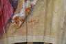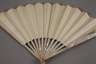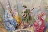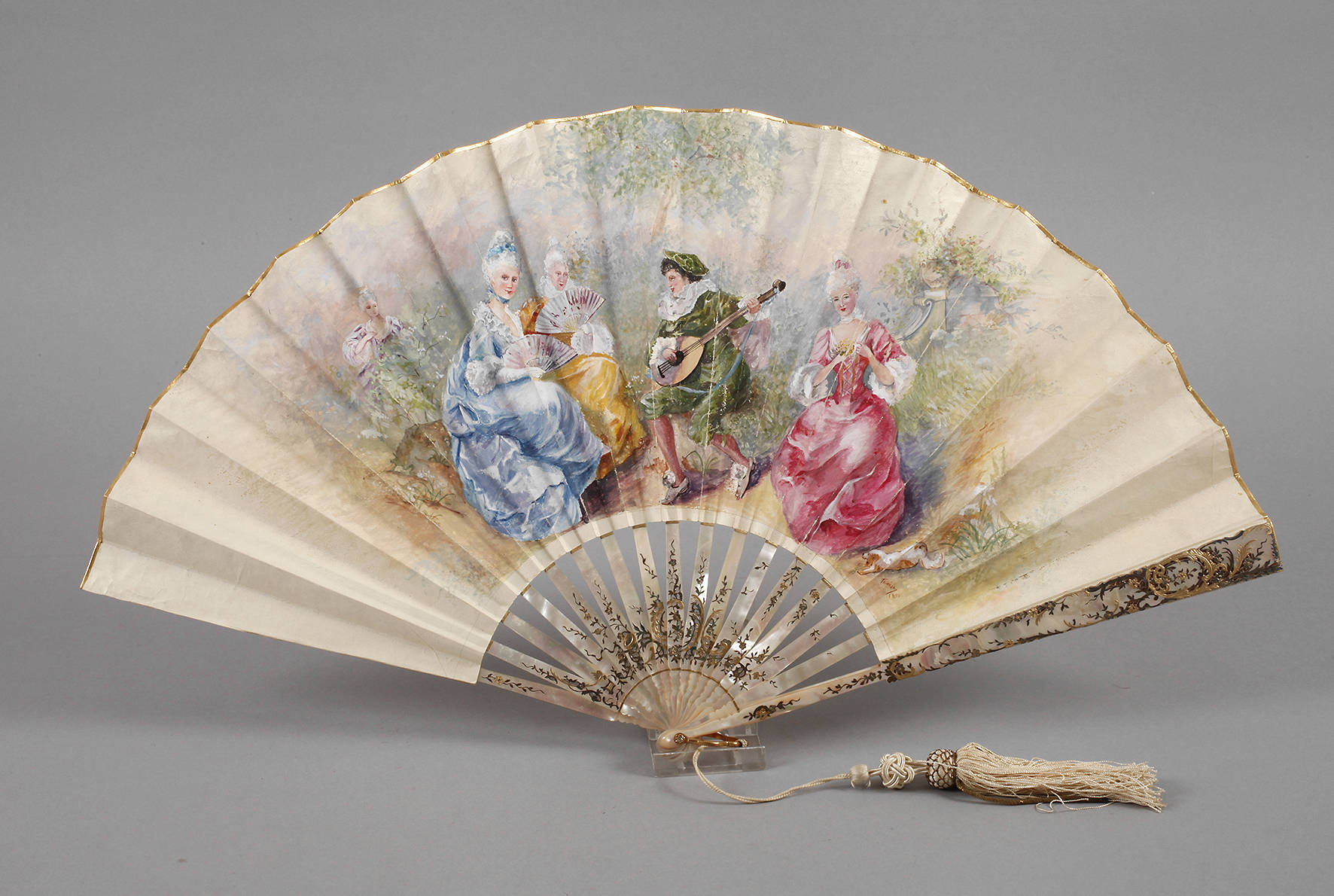 signiert Thérése und datiert 1895, Gestänge aus Perlmutt, fein ornamental durchbrochen, silberbronziert bzw. vergoldet, Papierbespannung in zarter historisierender Malerei, Mischtechnik (Gouache über Blei), Rokokogesellschaft im Lustgarten, abgehängte Troddel, min. Altersspuren, im Etui, L 60 cm.