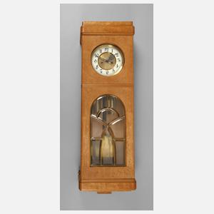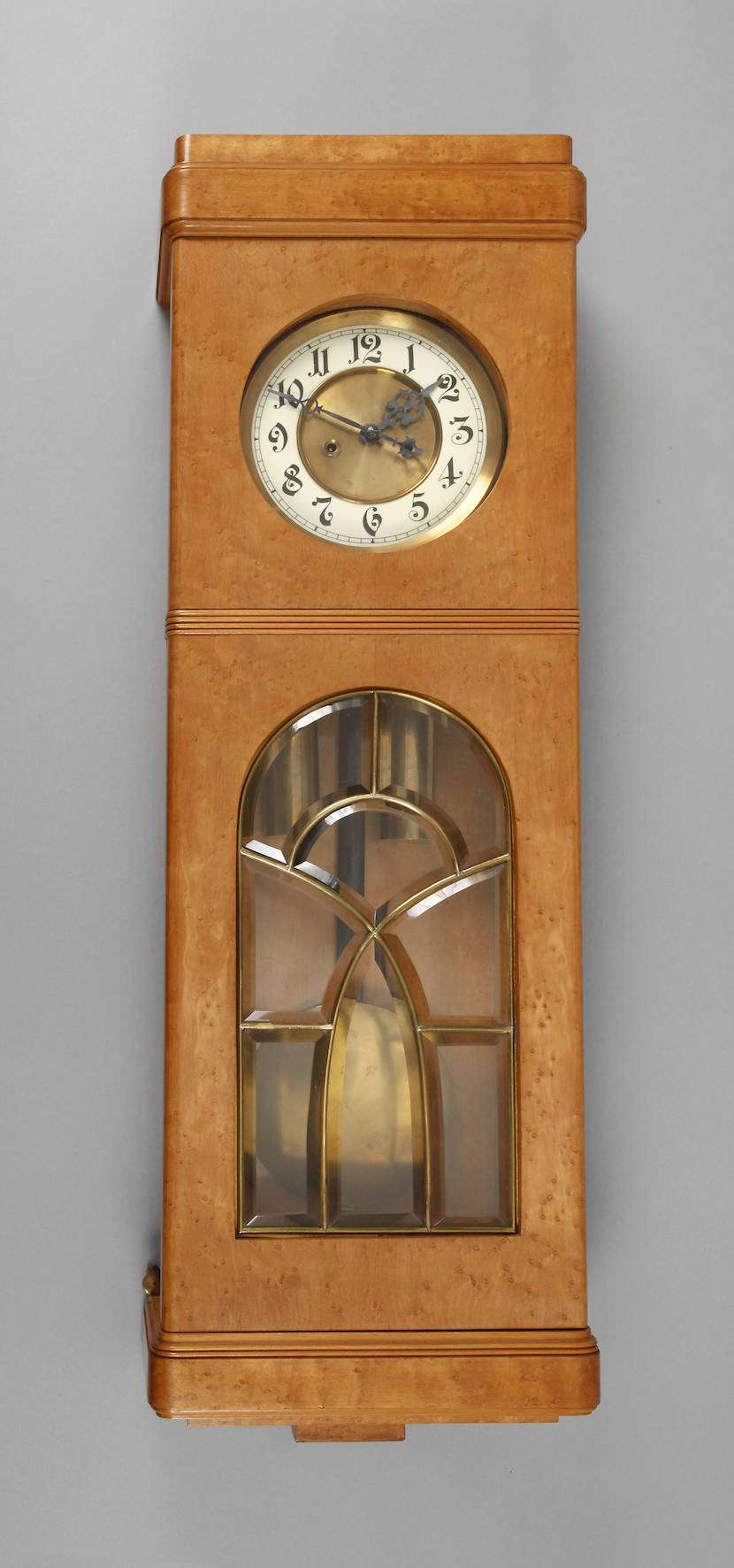 um 1900, zwei Gewichte, Halbstundenschlag auf Tonfeder, emaillierter Ziffernring, seltenes helles Gehäuse in Vogelaugenahorn furniert, Front mit in Messing gefassten, facettierten Glasscheiben, funktionstüchtig, H 93 x B 29 x T 13 cm.