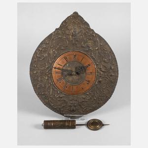 gemarkt J. Jagemann, Kunstgewerbliche Werkstätten für Uhren München, um 1900, im Renaissancestil gestaltete Front aus getriebenem Messingblech patiniert, Ziffernring aus Kupfer mit Ätzdekor, einfaches Holzplatinenwerk ohne Schlag, funktionstüchtig, H 38 cm.