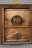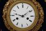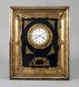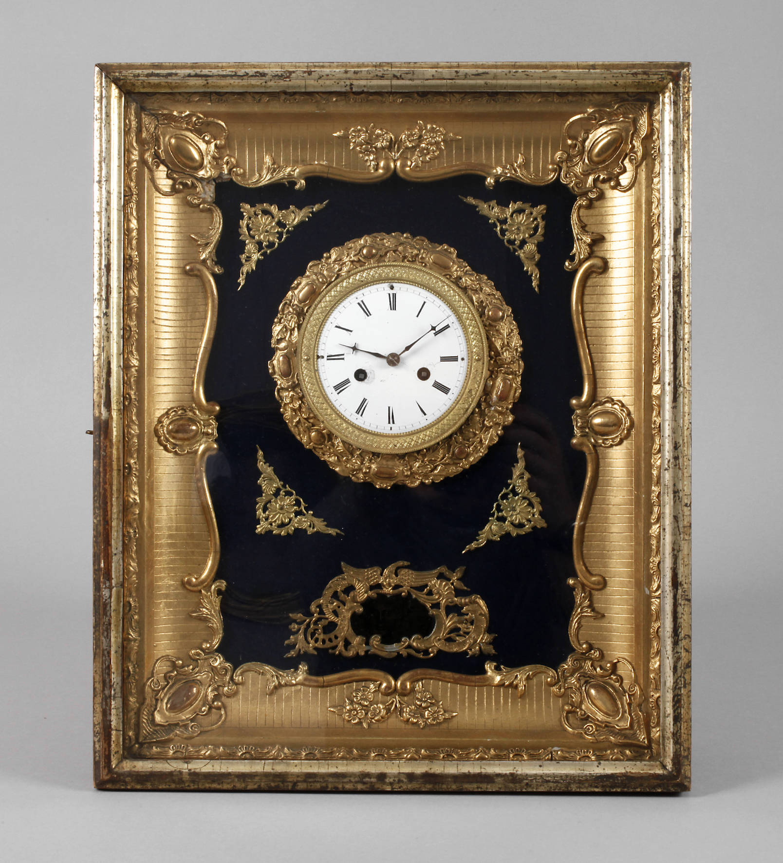 um 1840, Pendulenwerk mit Stundenschlag auf Tonfeder, Pendel mit Fadenaufhängung, prächtiger vergoldeter Rahmen mit verglaster Tür, emailliertes Ziffernblatt auf dunkelblauem Samt, Aussparung für Pendellinse,Werk läuft, eine kleine Applikation fehlt, sonst Z 2, Maße 44 x 37 x 12 cm.
