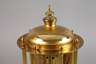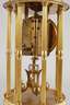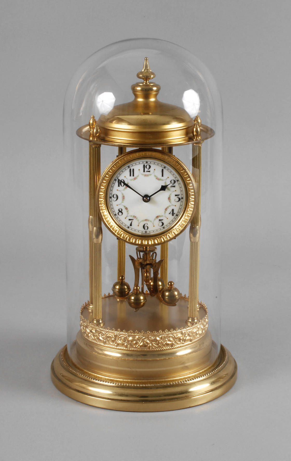 um 1900, ungemarkt, sogenannter Jahresläufer, Messing vergoldet, emailliertes Ziffernblatt mit farbigen Festons verziert, originaler Glassturz, funktionstüchtig, Z 1–2, mit Schlüssel, H 42 cm.