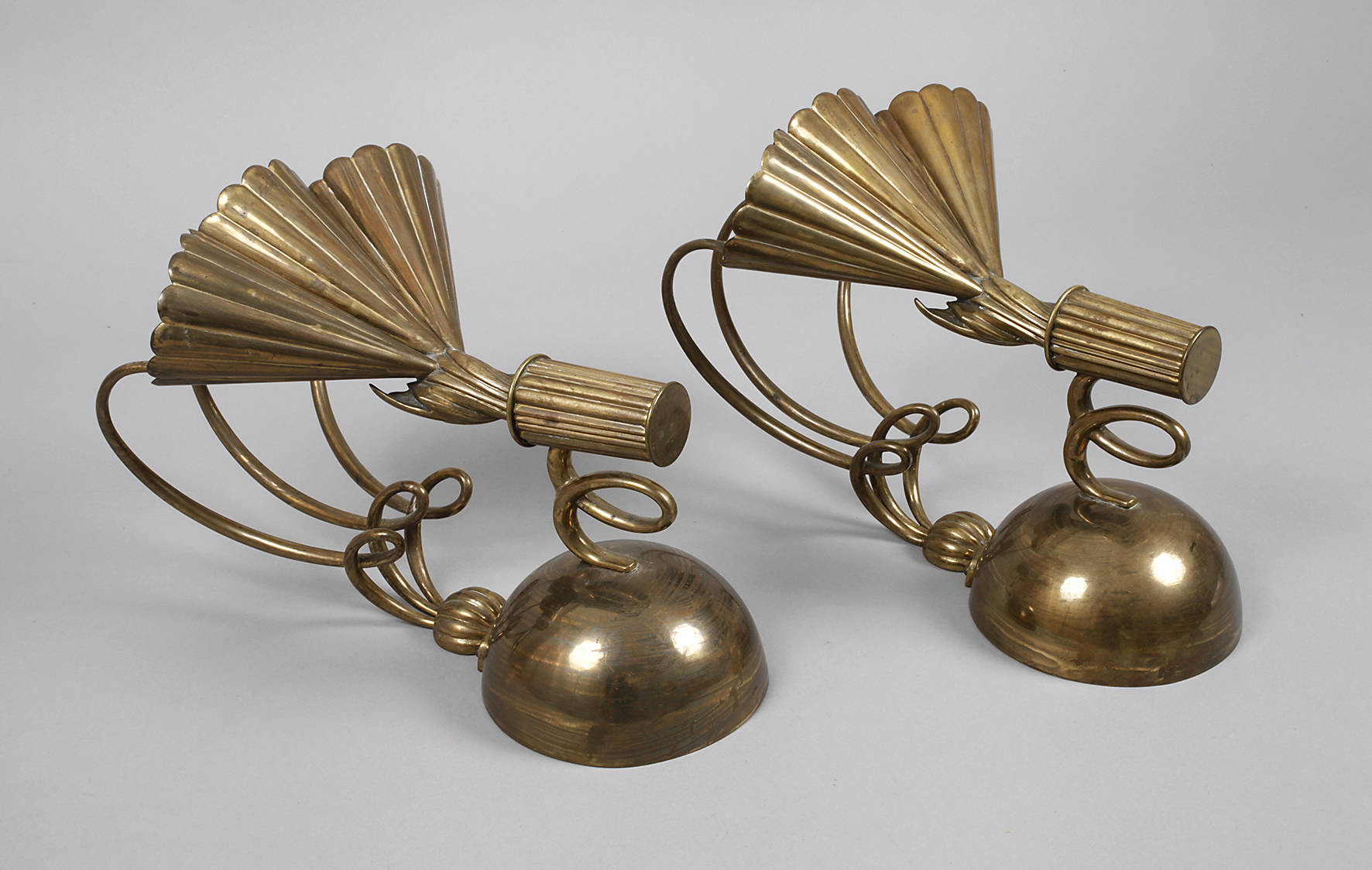 um 1925, ungemarkt, in der Art von Otto Prutscher, Messing massiv, teils getrieben und zaponiert, halbkugelförmige Blaker mit spiralförmigen Leuchterarmen und gerippten, kegelförmigen, dreiteiligen Lampenfassungen, H je 30 cm.
