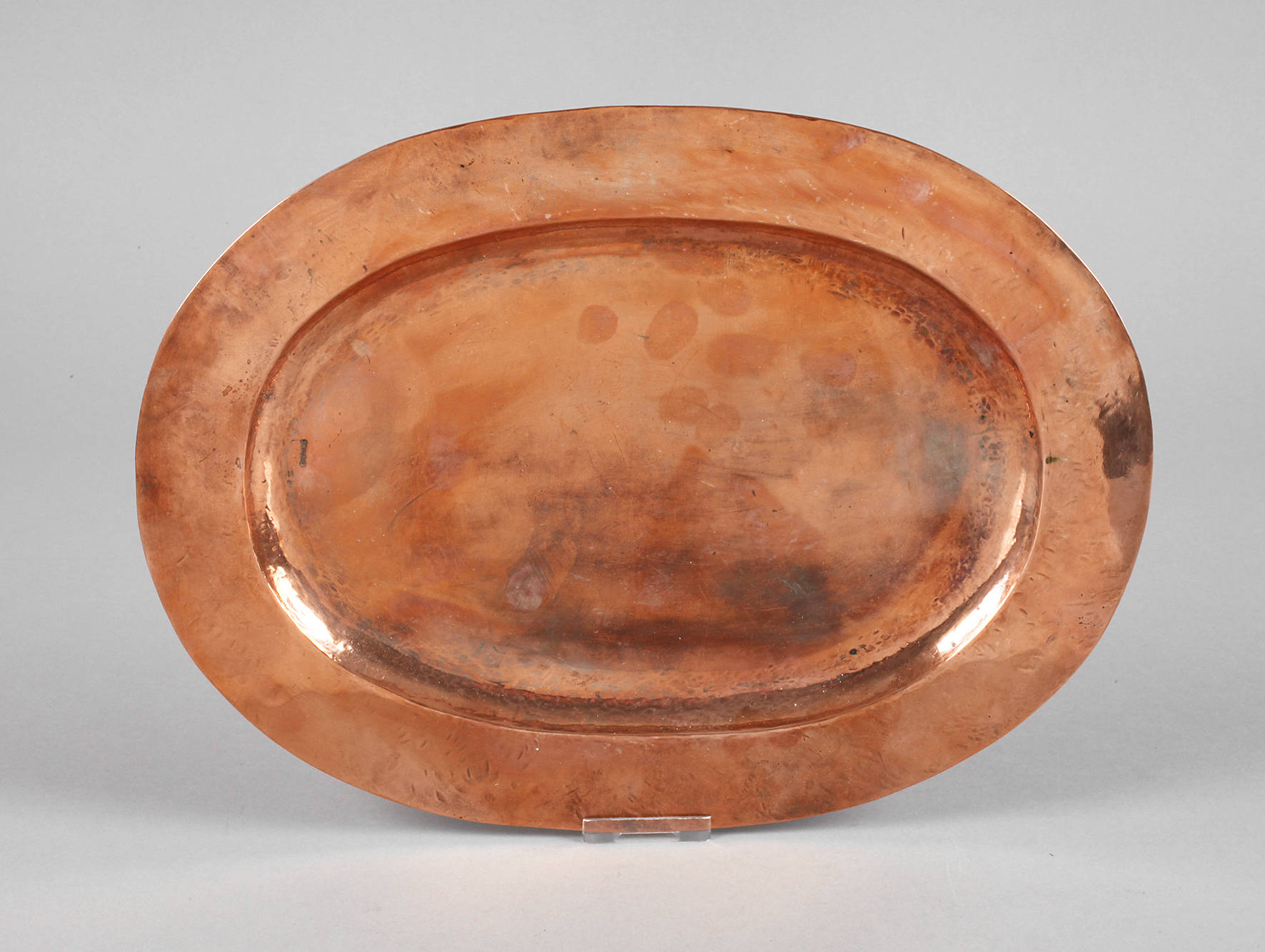 1920er Jahre, gestempelt Bauhaus, rückseitig Nachlassstempel Hans Kessler, getriebene, flach gemuldete Schale in schlichter Ovalform, unbekannte Schülerarbeit, sehr guter Originalzustand, L 31,3 cm. Künstlerinfo: dt. Maler, Graphiker und Architekt (1906 Essen bis 2000 Krefeld), 1929-31 Studium der Architektur an der Technischen Hochschule in Stuttgart, ab 1931 Studium am Bauhaus in Dessau und hier Schüler bei Wassily Kandinsky, Josef Albers, Lilly Reich, Ludwig Mies van der Rohe und Ludwig Hilberseimer, kurzzeitig in einem Architekturbüro tätig, ab 1934 in verschiedenen Positionen bei der Friedrich-Alfred-Hütte in Rheinhausen tätig und parallel künstlerisch Beschäftigung, nach seiner Pensionierung 1971 bis ins hohen Alter künstlerisch tätig, Quelle: pluspedia.