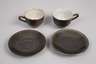 Entwurf Marguerite Friedlaender um 1935, geprägte Burgmarke, Kännchen mit Künstlersignet, ziegelroter Scherben, innen hellgrau glasiert, außen verlaufende dunkelbraune Lüsterglasur, fünf Tassen, sechs Untertassen, ein Sahnekännchen, diese mit zwei stärkeren Bestoßungen am Rand, eine Tasse mit kleinem Chip, H max. 6,5 cm.