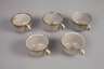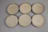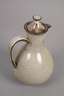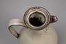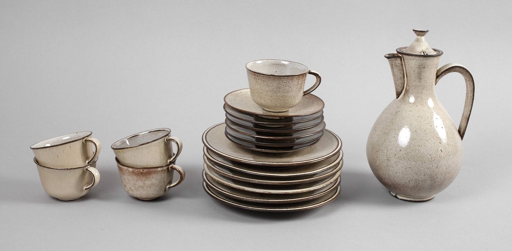 Entwurf um 1935, geprägte Burgmarke, dunkelbrauner Scherben mit gesprenkelter weißlicher Glasur, kugeliger Kannenkörper, konisch erweiterter Hals mit eingesetzter Ausgußröhre, Bandhenkel, die Ränder dunkel abgesetzt, bestehend aus Kanne, sechs Tellern, sechs Untertassen und fünf Tassen, eine Untertasse mit größerer oberflächlicher Fehlstelle, zwei Tassen mit Gebrauchsspuren (innen glasurrissig und ein kleiner Chip, H Kanne 25 cm. Quelle: Katja Schneider, Burg Giebichenstein, Tafelband 1992, S. 324, Abb. 229.3.
