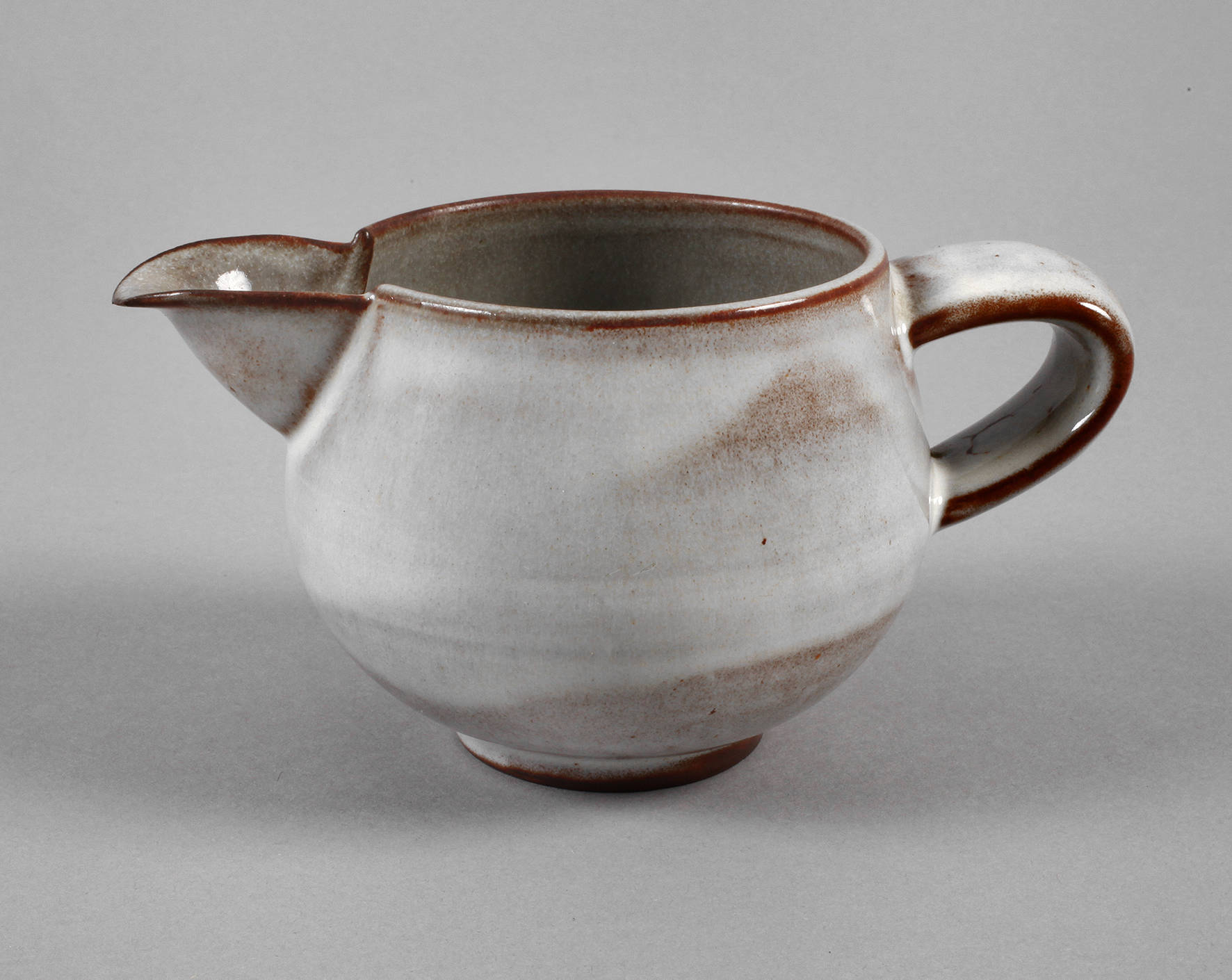 Entwurf um 1926, monogrammiert OL mit Unterstrich, rotbrauner Scherben mit weißlicher transparenter Glasur, kugelige Form mit breitem Ausguß und breitem Bandhenkel, innen minimal nicht durchgehend gasurrissig, L 16 cm. Quelle: MoMA Museum of modern Art im Internet.