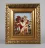 1920er Jahre, monogrammiert G.MX?, flache rechteckige Porzellanbildplatte mit polychromer Bemalung, in floral reliefierter Leiste der Zeit, diese minimal rest.bed. Maße Platte 22,5 cm x 17,5 cm, Total 36 cm x 32 cm.