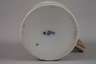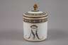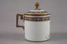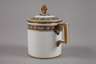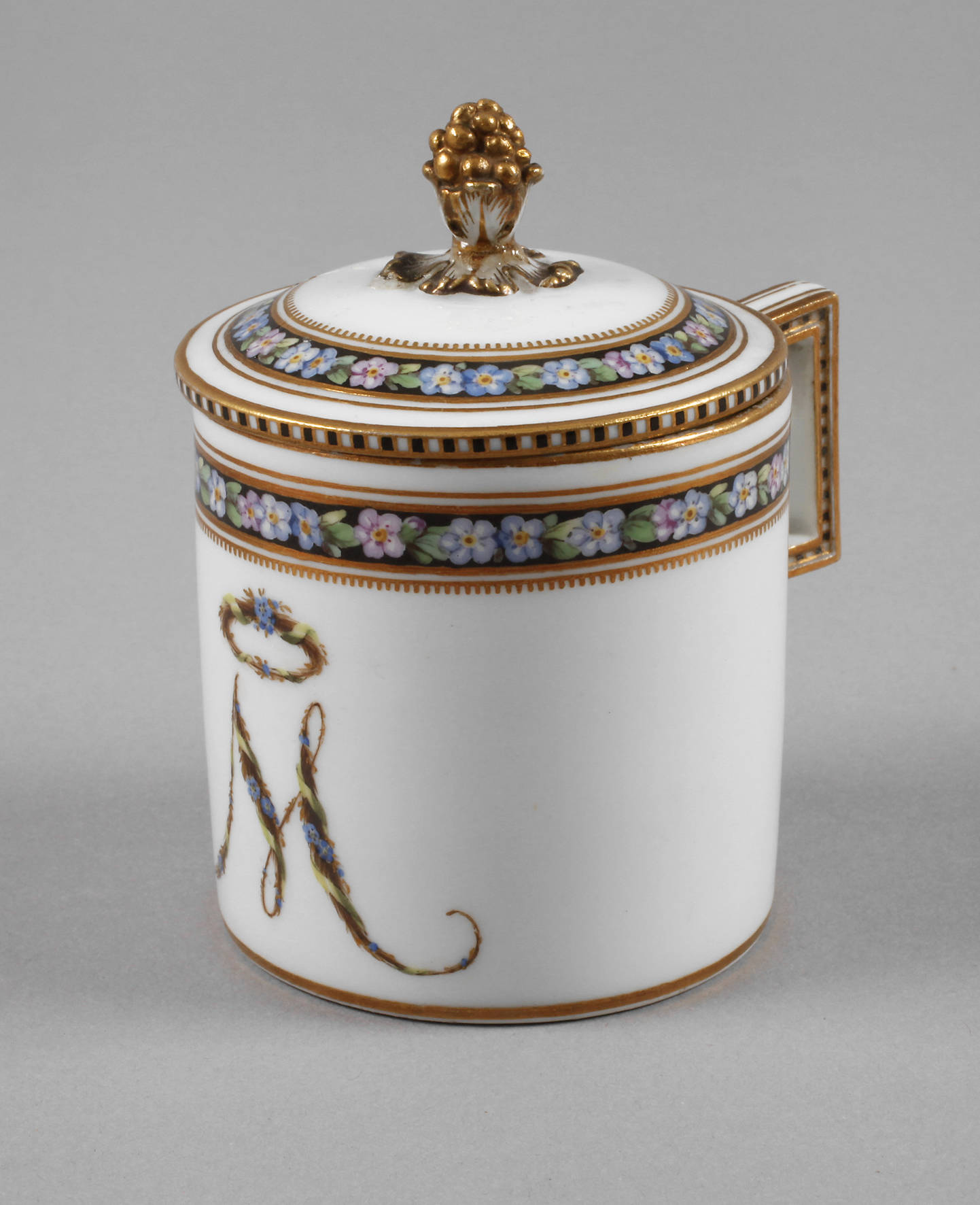 Marcolinizeit um 1800, blaue Schwertermarke mit Stern, Pinselnummer 8, Zylinderform mit abgekantetem Henkel, Tasse mit Traubenknauf, bemalt mit bunten Bändern, vergoldet, schauseitig Besitzermonogramm M, Knauf geklebt, H zusammen 9 cm.