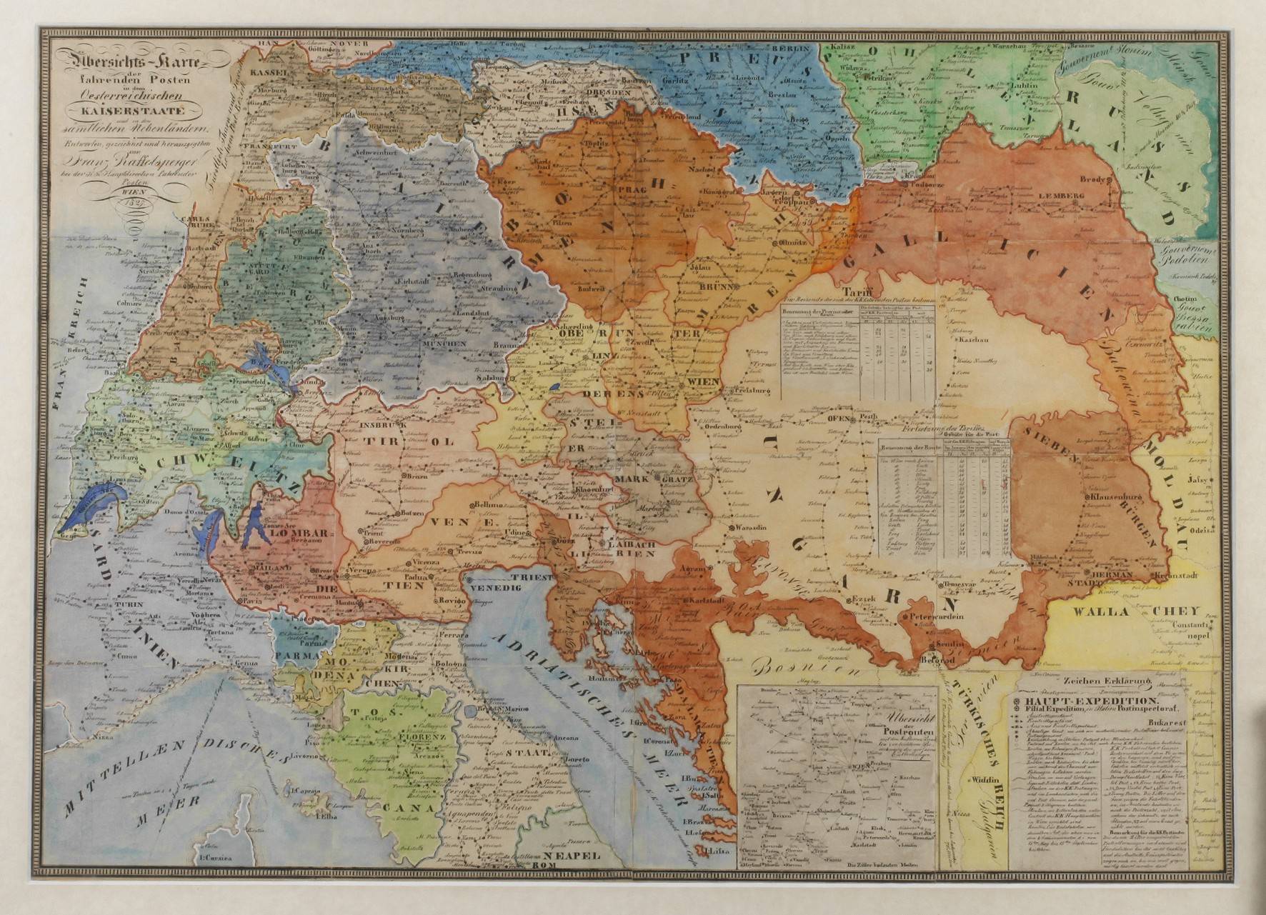 oben links ausführlich betitelt „Übersichts-Karte der fahrenden Posten in dem Oesterreichischen Kaiserstaate und in den sämtlichen Nebenländern von Franz Raffelsperger… Wien 1827“, Mitteleuropa umfassende Karte mit Einzeichnung der Postrouten der kaiserlich und königlichen Post von Österreich, in der Darstellung zwei Tabellen mit Posttarifen und im unterem Bereich Legende, kolorierter Stahlstich, geglättete Faltlinien, Mittelfalz hinterlegt, unter Passepartout und hinter Glas gerahmt, Passepartoutausschnitt ca. 50 x 70 cm. Künstlerinfo: auch Franz Raffelberger oder Ferenc Raffelperger: österr. Kartograph und Geograph (1793 Modern/Modra bis 1861 Wien), Sohn eines Gutsbesitzers, 1804–05 Besuch des Gymnasiums in Wien, 1820–49 Beamter im Postdienst und Beschäftigung mit der Modernisierung des Postwesens, erhielt 1839 ein Goldmedaille auf der Wiener Gewerbeausstellung für seine „General-Post- und Eisenbahnkarte des Kaiserthums Österreich“, 1843 Gründung der „K.k. außerordentlich ausschließlich privilegierte Kunstanstalt“ und Herausgeber der Zeitung der „Der Unpartheiische“, Quelle: Wurzbach, Wikipedia und Internet.